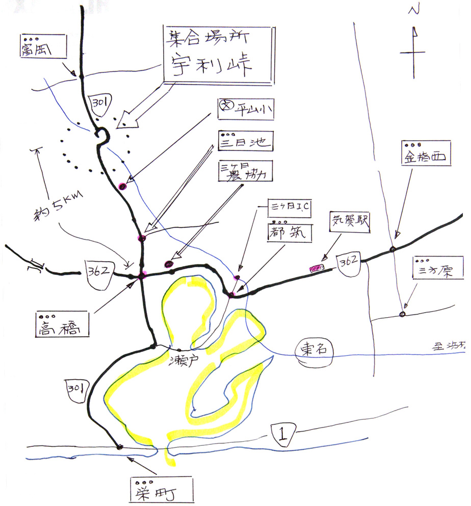 集合場所:宇利峠(案内図を参照下さい)国道301号の側道に駐車〉