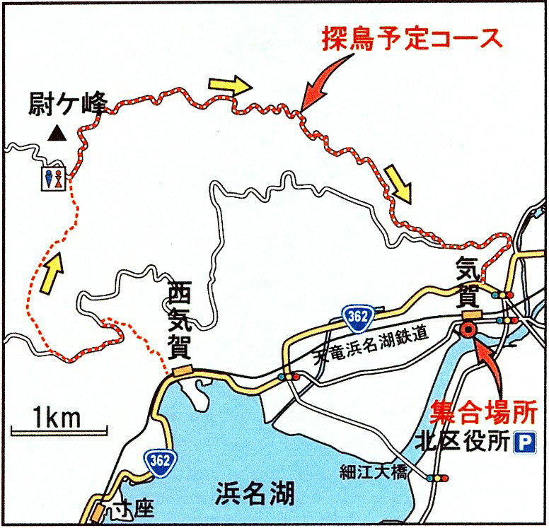身近な低山ハイキングで日頃の運動不足を解消しましょう。西気賀から石畳の旧姫街道を引佐峠まで歩き、そこから尉ヶ峰(433m)に登り浜名湖の眺望を楽しみます。尾根道でカラ類を探しながら細江公園経由で北区役所に戻ります。歩行5時間程度。