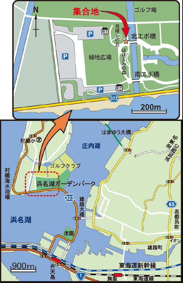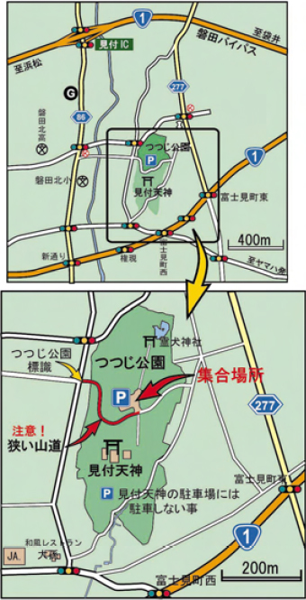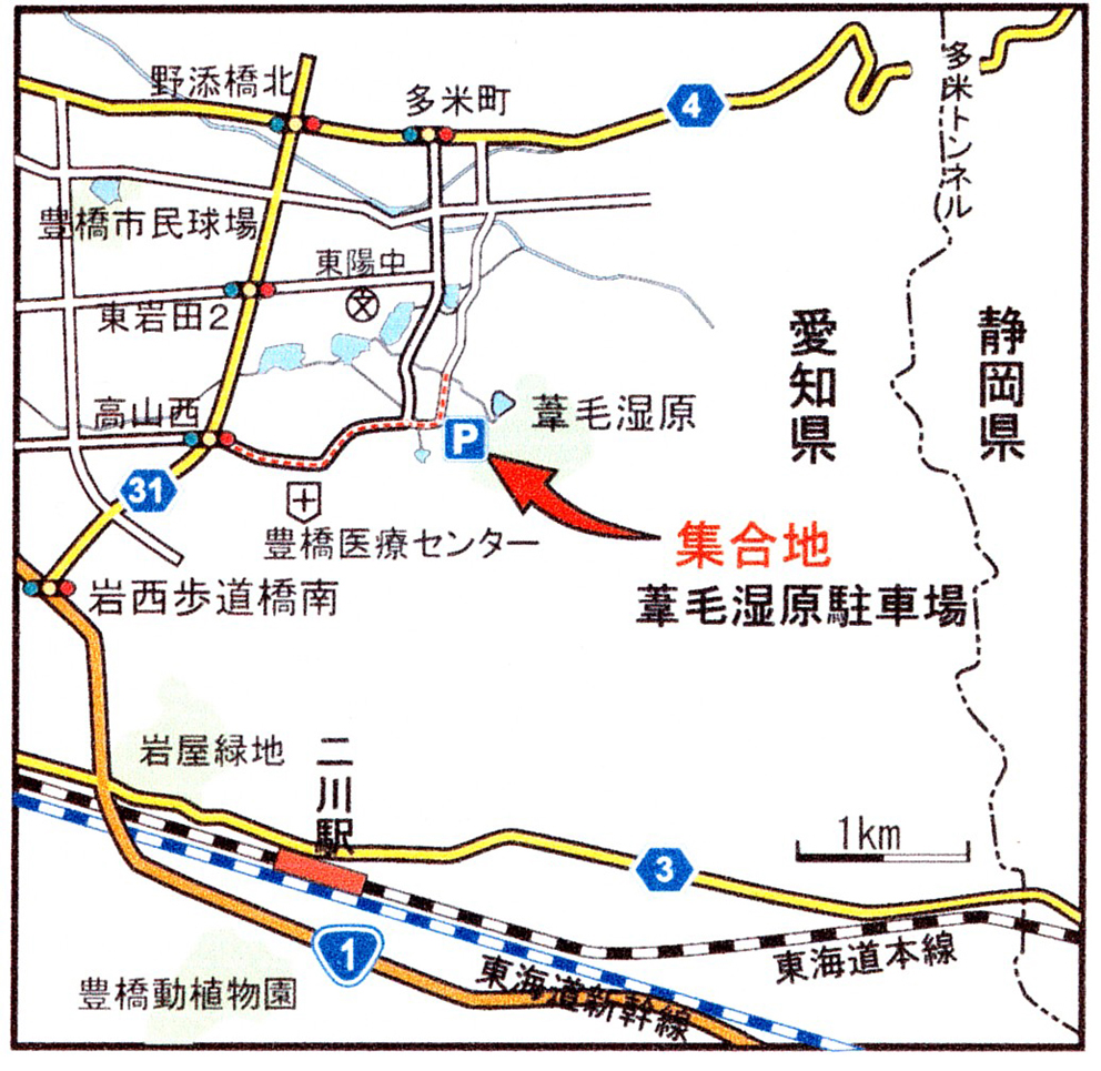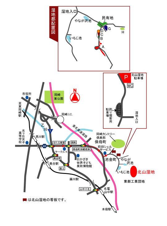 日 時:4月13日(日)9:00〜11:00 集合場所:磐田大池東側の周遊路なお駐車場は世話人が指示します。この指示にしたがって駐車して下さい。 公共交通アクセス:J R磐田駅南口から遠鉄バス福田・豊浜行きで静岡産業大学入口下車東へ徒歩5分、北へ1分。またはJR磐田駅南口から徒歩20分。 そ の 他:雨天中止 磐田大池へのアクセス ------------------------------------------------------ 北山湿地探鳥会(愛知県岡崎市) - 終了 難易度 愛知県の三河地方の丘陵の湿原での自然観察を楽しみます。ギフチョウが飛び交う頃は湿原では固有種のナンカイイワカガミやハルリンドウなどの多くの花が咲き始め、サシバやオオルリ、センダイムシクイなどの夏鳥たちも渡って来る頃です。集合地の駅からは正味往復歩行時間3時間位の行程で、起伏は静岡県立森林公園よりちょっとハードな程度です。 日 時:4月12日(土) 8:40〜14:00 集合場所:名鉄本宿駅改札口前 *自家用車でお越しの方は本宿駅駐車場にも停めることが出来ます。(有料) *北山湿地駐車場に直接に行かれる方は10:00迄に湿地入口看板前に来て下さい。ただし、この場合は必ず前日までに下記お問いあわせ先まで電話連絡をして下さい。合流の不具合を避けるために必ずお願いします。 北山湿地駐車場からの場合、歩行時間は正味1時間程度です。ギフチョウのシーズンは駐車場が混雑すると思われますので、集合時間の20〜30分前くらいに着くように余裕を持ってお越し下さい。 持ち物 :昼食、飲み物、敷物、嗜好品、雨具、双眼鏡など。 その他 :雨天中止 自家用車でのアクセスは下記地図を参照下さい。 北山湿地へ直接行く場合のアクセス(岡崎市提供) ------------------------------------------------------ 葦毛湿原探鳥会(愛知県・豊橋市) - 終了 難易度 葦毛湿原でハルリンドウ、ショウジョウバカマなど早春の草花を観察しながら探鳥したあと、2グループに分かれ、健脚組はカタクリ群生地までハイキング、散策組は周辺の林で探鳥を続けます。 日 時:3月23日(日) 9:00〜13:00 集合場所:葦毛湿原駐車場(トイレあり) 公共交通アクセス:豊橋駅から豊橋鉄道バス?番乗り場,赤岩口行きで岩崎・葦毛湿原下車徒歩10分 持ち物:弁当、飲み物、雨具 その他:雨天中止 (参考)前回の行事報告 http://www.wbsjtm.com/ttantyokaihokoku33.htm ------------------------------------------------------ かぶと塚公園探鳥会(磐田市) - 終了 難易度 磐田警察署に隣接する国道1号線沿いの都市公園ですが、ここでの探鳥会は今回で2回目す。2012年3月の探鳥会ではアオバトが観察され、参加者一同大変驚きました。夏に村櫛海岸で見られるあのアオバトのような鳥が、今年も見られるのでしょうか。 日 時:3月8日(土) 7:30〜10:00 集合場所:かぶと塚公園北東第2駐車場付近正面の体育館の第1駐車場ではなく、裏側の第2駐車場です。 公共交通アクセス:JR磐田駅から遠鉄バス加茂川又は国道加茂川で下車、徒歩15分。又はJR磐田駅からタクシー8分。 持ち物等:防寒具、雨具など その他 :雨天中止、トイレあり。 双眼鏡・図鑑の貸し出しあり。 お問いあわせ先:原 信一郎(090-4405-4486)(0538-34-0057) (参考) <前回認めた鳥> カルガモ,トビ、アオバト,コゲラ、ハクセキレイ,セグロセキレイ,モズ,ジョウビタキ、イソヒヨドリ,シロハラ,ツグミ、シジュウカラ、メジロ、カワラヒワ,イカル など (参考)前回の行事報告 http://www.wbsjtm.com/ttantyokaihokoku29.htm ------------------------------------------------------ つつじ公園探鳥会(磐田市) - 終了 難易度