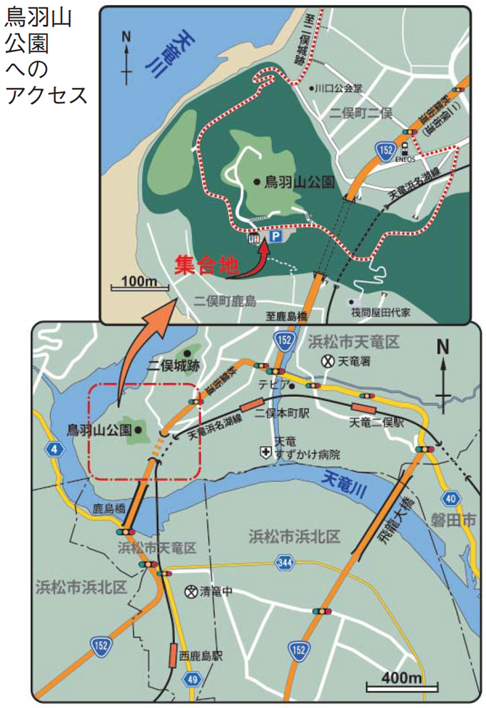 日 時:3月2日(日)7:30〜9:30 集合場所:つつじ公園駐車場(トイレ有り) 公共交通アクセス:JR磐田駅から遠鉄バス 見付・磐田営業所行き、見付下車、徒歩10分。又は、JR磐田駅からタクシー15分。 その他:雨天中止 (参考) <前回認めた鳥> ジョウビタキ、シロハラ、エナガ、ヒガラ、ヤマガラ、アオジ、マヒワ、ウソ、シメ など (参考)前回の行事報告 http://www.wbsjtm.com/ttantyokaihokoku33.htm ------------------------------------------------------ 鳥羽山公園・二俣城跡探鳥会(浜松市天竜区) - 終了 難易度 春が待ち遠しい2月末、暖かい部屋を飛び出して小鳥達に出会いに来てみませんか。カラ類のほかウソやレンジャクに出会えたらラッキーですね。まだまだ北西の風が強く天竜川からの風は冷たいですが、川面にはオシドリやカワアイサの姿が見えるかも知れません。 日 時:2月22日(土)9:00〜11:45 集合地:鳥羽山公園駐車場(地図参照) 公共交通アクセス:天竜浜名湖鉄道「二俣本町駅」から徒歩15分。上り(掛川行き)8:24着下り(新所原行き)8:36着 持ち物:防寒具・雨具・運動靴など その他:雨天中止 ------------------------------------------------------ 小笠山探鳥会(掛川市) - 終了 難易度 冬の里山の自然を楽しみましょう。多少のアップダウンはありますが、なだらかな道です。雑木林や池があり、木漏れ日の中を探します。コース折り返し地点のマスラノ池で、水鳥が待っていてくれるのを期待しましょう。 日 時:2月16日(日) 8:00〜10:30 集合場所:掛川市富士見台霊園駐車場 公共交通アクセス:JR掛川駅南口から徒歩40分 持ち物等:防寒具、雨具など そ の 他:雨天中止、霊園にトイレあり、双眼鏡・図鑑の貸し出しあり <昨年認めた鳥> ------------------------------------------------------ 浜名湖ガーデンパーク探鳥会(浜松市西区) - 終了