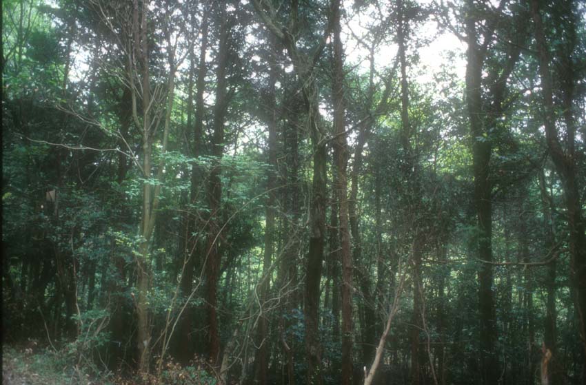 東海道本線「袋井」駅から、菩提(ぼだい)経由、法多山(はったさん)行きバスで20分、「法多坂」で降りる。茶畑の中の十字路を南に折れて10分程で、林道の車止めゲートに着く。この深鳥地のベストシーズンは初夏、ゲート付近の赤松林では、オオルリ、サンコウチョウの声が、訪問者を出迎えてくれる。沢沿いの林道を歩くと、ところどころに、ササユリの白い花の咲く伐採地が開けている。植林されて間もない桧の梢でさえずっているのはホオジロだ。近くに繁みからは、ウグイスのさえずりも聞こえてくる。ここの川に沿っては、サンコウチョウが多数生息していて、道すがら「ツキ・ヒ・ホシ・ポイポイ」のあの陽気な声があちこちで聞かれる。路傍の木に身を寄せて、そっと口笛で真似てみると長い尾をヒラヒラさせたサンコウチョウが、頭の上にやってくるかもしれない。また上空に目をやると、旋回するサシバや、空を横切るハチクマの姿を見ることができるだろう。また、晩秋から冬にかけては、北風にゆれるススキの穂先にカシラダカやミヤマホオジロが止まり、空には、ハイタカやオオタカが舞う。歩き始めて1時間半。小笠神社の鳥居に着く。シラカシの大木を見ながら尾根を歩くと、谷すじや杉林から、キビタキの澄んだ声が聞こえてくる。周りのウバメガシの林床には、ギンリョウソウの幽かな花を見つけることがある。ヒトツバの繁るがけを見ながら、武田と徳川の「兵どもが夢のあと」を思い、小道を下りると、「小笠山ビジターセンター」に着く。センターの横を通ると小笠神社の本殿につく。本殿の板塀には、アオゲラのあけた大きな穴がある。穴だけではなく本殿裏のシイの木や松の梢でピューと鳴く声や姿も見られるかも知れない。また神社周辺では、ホトトギスがよく見られ、冬には、シジュウカラ、エナガ、ヒガラ、コゲラなどのカラ類の混群がよく見られる。帰りは、神社の鳥居を右にとって、小笠山縦貫道沿いに下り、菩提を通って下りてみよう。谷すじに夏ならミソゴイ、冬ならミソサザイに出会うこともある。〔交通〕