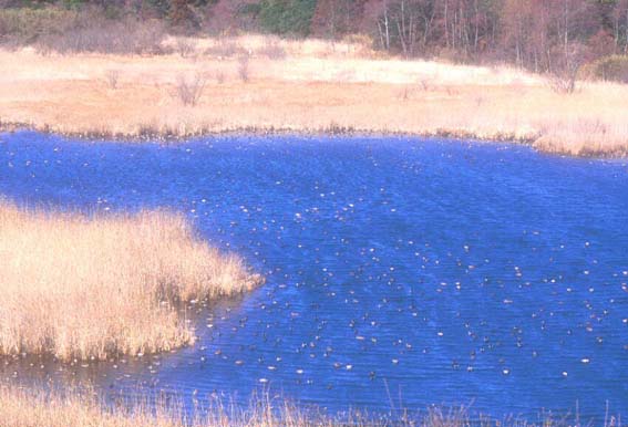 ●各部会活動桶ケ谷沼 静岡県磐田市 磐田原台地の東南端に位置する淡水沼。良好な自然環境が保たれ、カモ類を中心に静かな環境の中で観察できる。トンボが多いことでも有名。平成16年にはビジターセンターもできた。 観察適期は晩秋から早春までのカモ類と小鳥類。最近の暖冬傾向で個体数は減ったが、厳冬期には1,000〜1,500羽集まるカモ類は見応えがある。最も多いのがマガモで朝日を受けて輝く頭部の緑色の金属光沢の美しさは格別。希少種のトモエガモも毎年姿を見せるしコハクチョウも越冬の常連になっている。ただ、トモエガモもコハクチョウもマコモの群落の中にいることが多いので、姿を見るには根気がいる。沼北部の観察路ではルリビタキ、アオジ、シジュウカラの仲間を見掛ける機会が多い。