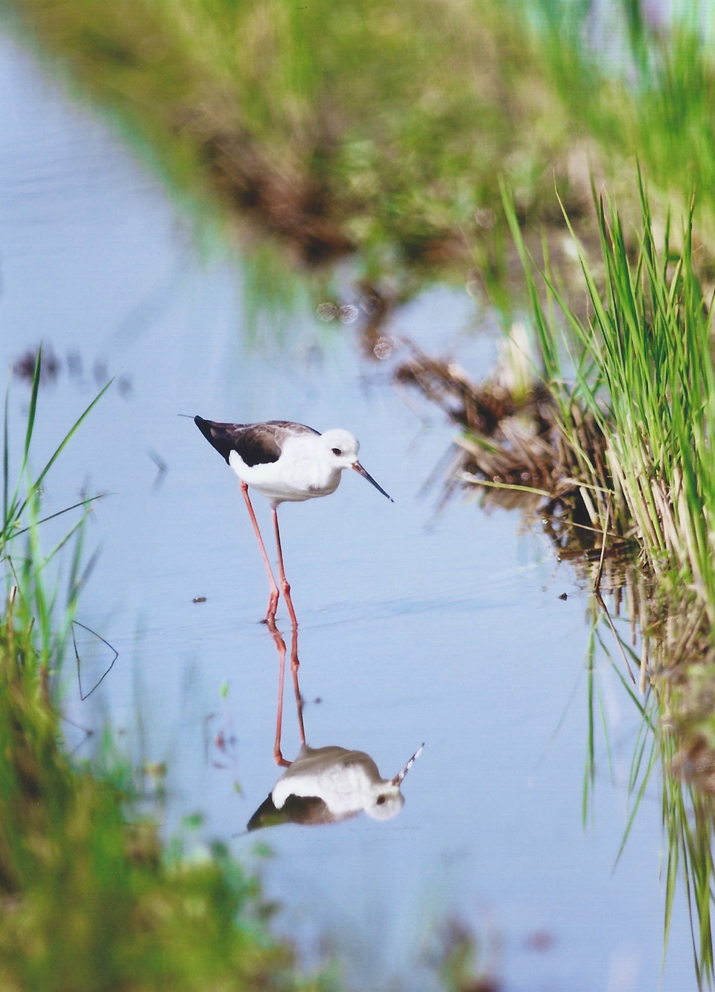 初めてみたセイタカシギ。脚の長さにびっくり。水鏡になっていた一枚です。