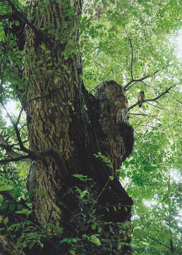 8 アオバズク やさしくアオバズクを抱擁する、樹齢300年のシイの木。昨年その役割を終えた。 撮影; 青木正男 7月 浜松市浜北区