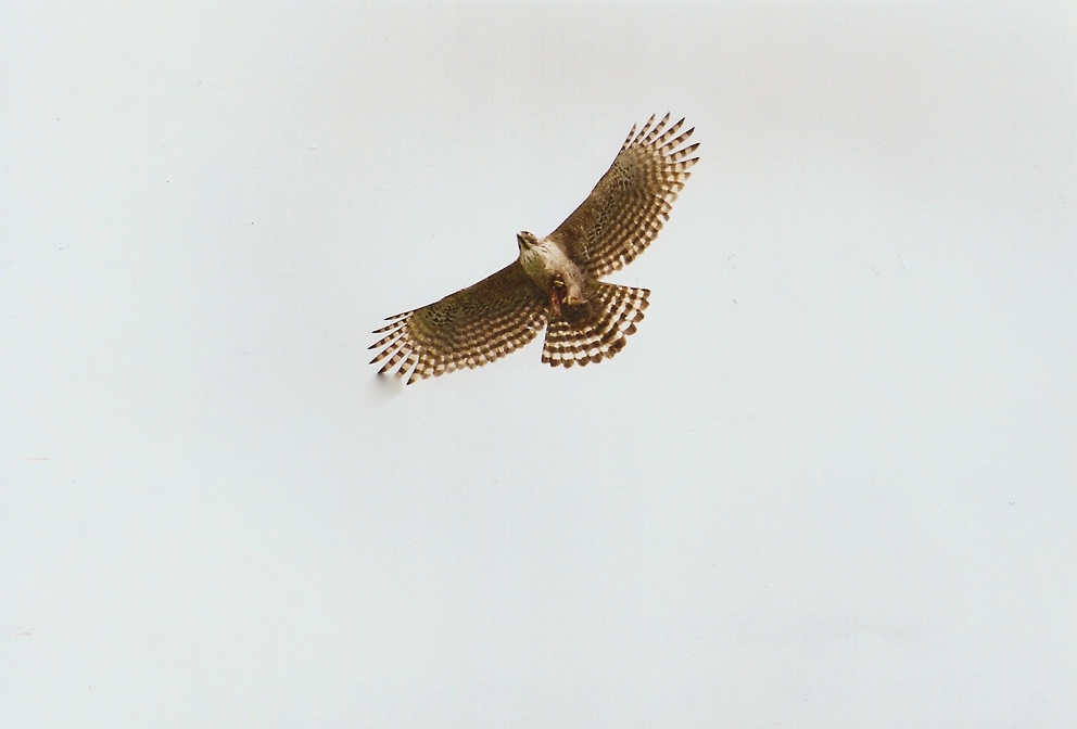 44 クマタカの飛翔 自分が食べた後、獲物を幼鳥のところに運んで行くクマタカの♀親。 撮影; 中村昌義 3月 天竜区