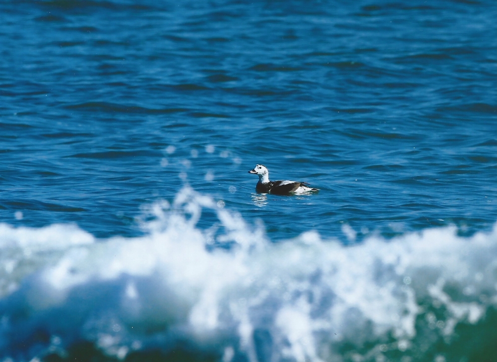 49 コオリガモ 押し寄せる波の向うに泳ぐ姿があった。 撮影; 山本昇志 1月 赤羽町