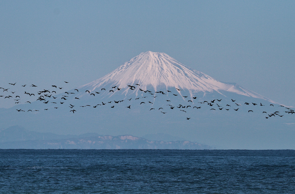 57 カワウ 雪化粧した富士をバックにカワウ一万羽! 圧巻でした。 撮影; 津久井克美 1月 御前崎