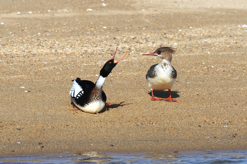 44 ウミアイサ 砂浜に上ったウミアイサのペアーを初めて見ました。 撮影; 藤井 彰 2月 三重県
