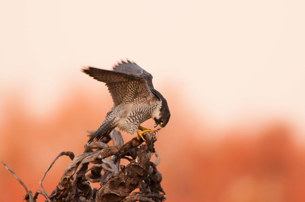 45 早暁(ハヤブサ) 年明けて間もない頃、夜明けの空を背に気合をいれるハヤブサ。 撮影; 小林雅彦 1月 天竜川