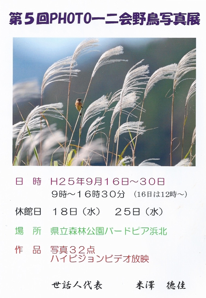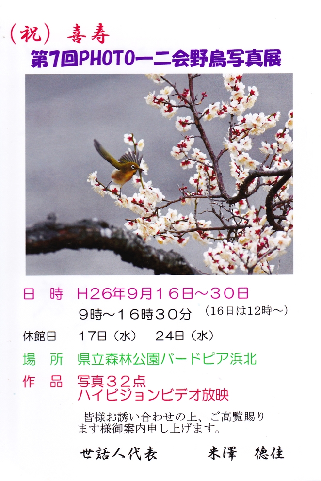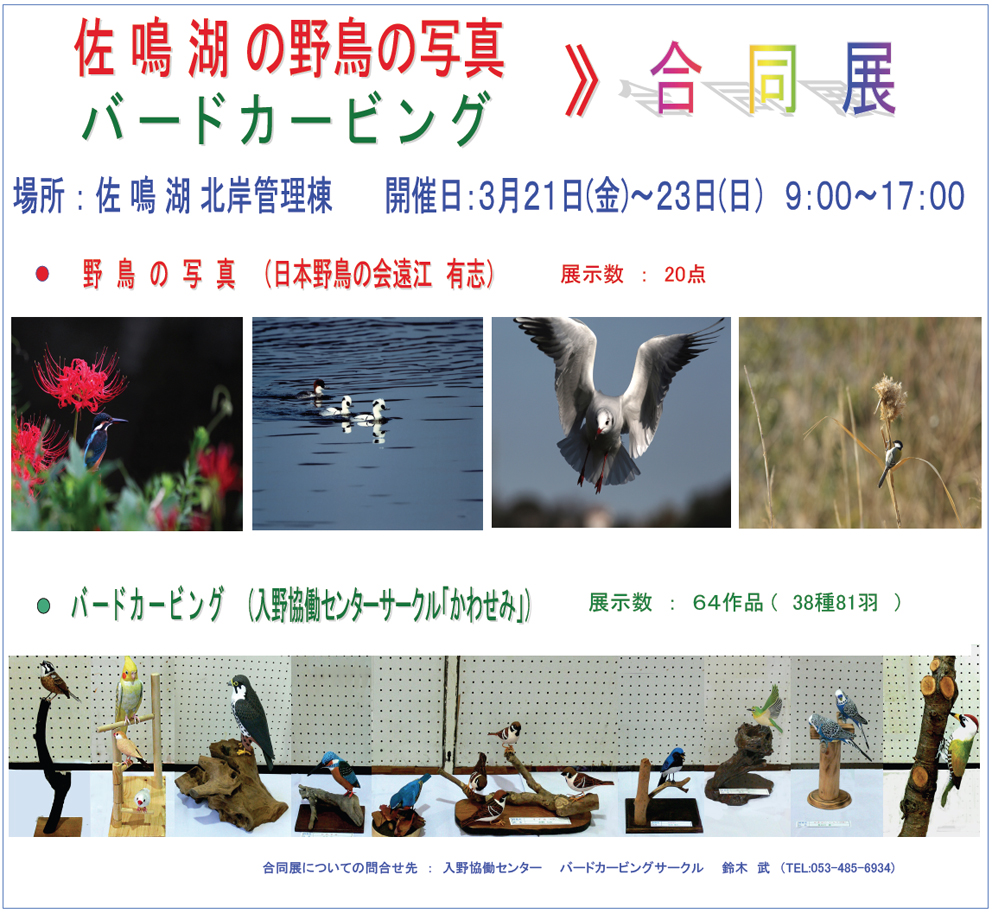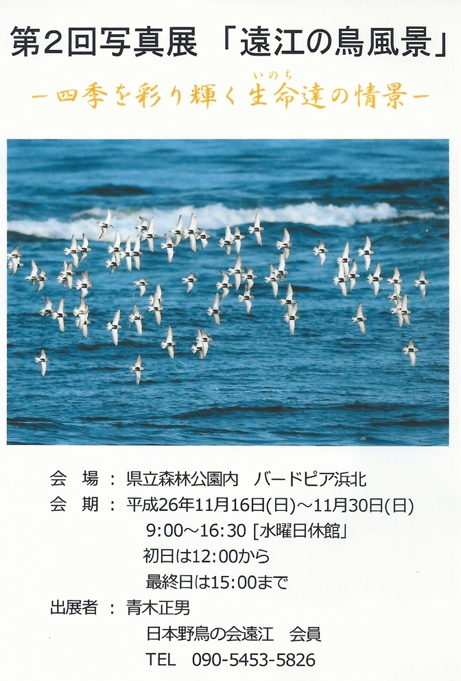 会 場:静岡県立森林公園内(浜松市・浜北区)・バードピア浜北 会 期:平成26年11月16(日)〜11月30日(日) 休館日 11/19(水)、11/26(水) 時 間:9:00〜16:30(初日は12:00より、最終日は15:00迄) 出展者:青木正男(日本野鳥の会遠江 会員)他 お問い合わせ先:青木正男(090-5453-5826)