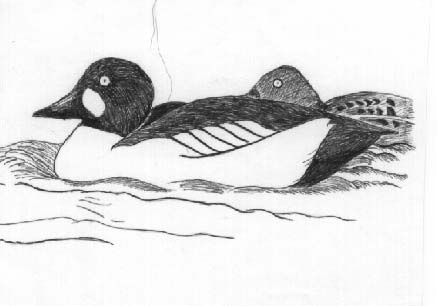 英名は「金色の目」。ただし「金目」はこの鳥の専売特許にあらず、他の潜水ガモにも存在する。一体どこを見ているのかよくわからない、焦点があるのかどうかも定かでない黄金の眼差しは無表情で、体形はおもちゃのようでもある。まるでデコイが浮かんでいるようにもみえる。そしてもうひとつのホオジロガモの特徴として有名なのがいわゆる「おむすび形の頭」である。たしかにこの形はユニークで愛嬌があることは間違いないのだが、顔の真ん中で光る鋭い目が、ただの可愛らしさと少し異なる不思議な雰囲気を醸し出しているようだ。やはりこの鳥のポイントは目が支配しているといえるのかもしれない。