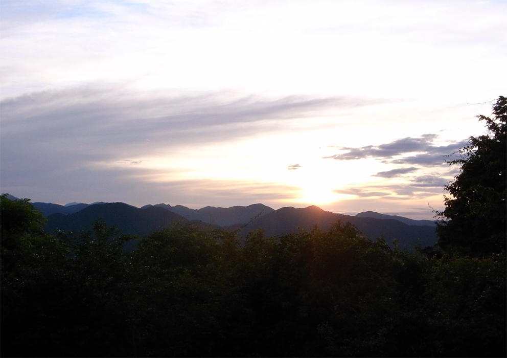 竜頭山避難小屋からの日の出 竜頭山山頂から カラ類の混群を観察 竜頭山探鳥会で認めた鳥:トビ、ホトトギス、トラツグミ、コゲラ、ヤマガラ、コガラ、ヒガラ、シジュウカラ、エナガ、キセキレイ、メジロ、ホオジロ、ウグイス、センダイムシクイ 等