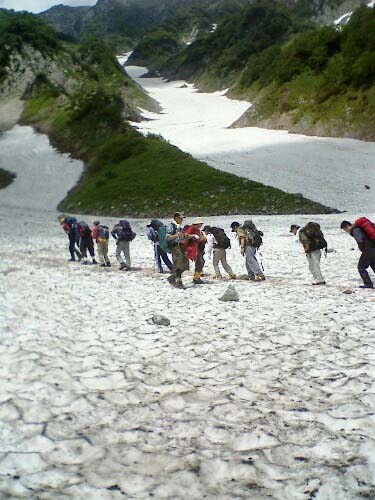 大雪渓を登る参加者達 ウルップソウ シラネアオイ キヌガサソウ 白馬岳探鳥会で認めた主な鳥:ホトトギス、ヨタカ、アマツバメ、ミソサザイ、イワヒバリ、ルリビタキ、ウグイス、メボソムシクイ、オオルリ、ウソ等