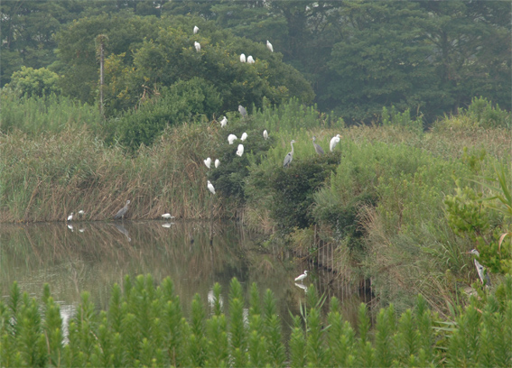 後背地の養鰻池のサギ山 サギも気持ち良さそう 汐川探鳥会で認めた主な鳥:コサギ、ダイサギ、アマサギ、ホシハジロ、ウミネコ、アオアシシギ、キアシシギ、クサシギ、オバシギ、イソシギ、オオソリハシシギ、ダイゼン、コチドリ、トウネン、キリアイ、セッカ、カワセミ、キジ、ケリ、イソヒヨドリ等