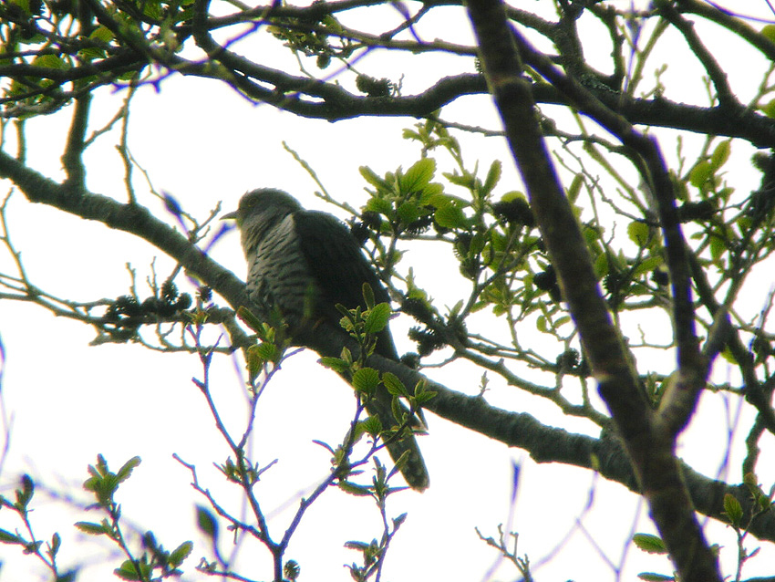 朝から快晴の気持ちの良いバードウオッチング日和でした。水窪のカモシカ館周辺をゆっくり回りツツドリの声がのどかに聞こえ、どこか奥のほうからアオバトの声がしました。センダイムシクイのチヨチヨビーもすぐ近くで聞こえ、ウグイスの声がどこでも聞かれました。常光寺山の登山道に沿った林道を歩いた時は、薄暗い杉林の中にキクイタダキの姿が見れました。折り返し点で、シロヤシオを見に、山を少し登りました。