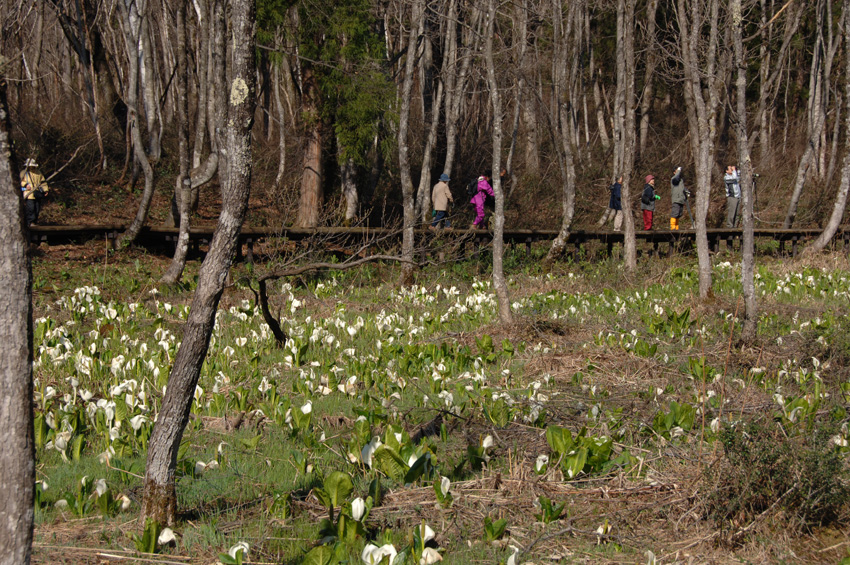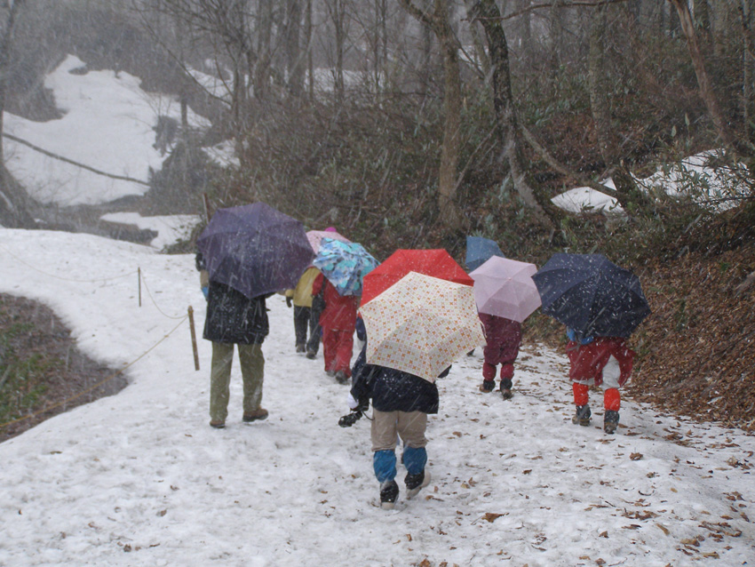 1日目では吹雪になり暖かい地方では体験し得ない雪に皆さん喜んでいました。2日目はとても暖かいお天気になり、白馬の自然の中を探鳥したり、ミズバショウやザゼンソウ、アズマイチゲやバイカモの花等を楽しみました。野鳥はアカゲラ、オシドリ、サンショウクイ、イカル、ニュウナイスズメ等39種を確認することができました。