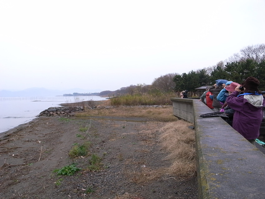 オオワシが見やすいところに 琵琶湖探鳥会で認めた主な鳥:カイツブリ、カンムリカイツブリ、ダイサギ、コサギ、ヘラサギ、クロツラヘラサギ、コハクチョウ、アオサギ、マガン、オオヒシクイ、マガモ、カルガモ、コガモ、ヒドリガモ、オナガガモ、ホシハジロ、キンクロハジロ、ヨシガモ、オカヨシガモ、カワアイサ、ミサゴ、トビ、オオワシ、オジロワシ、バン、オオバン、ケリ、イソシギ、イカルチドリ、オジロトウネン、カワセミ、ハクセキレイ、セグロセキレイ、モズ、ジョウビタキ、ホオジロ、アオジ、カワラヒワ、等