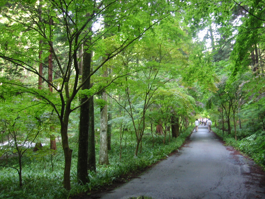 緑溢れる小国神社の参道 モリアオガエルも出現 小国神社探鳥会で認めた主な鳥:コゲラ、シジュウカラ、ヤマガラ、エナガ、サンコウチョウ、オオルリ、クロツグミ、キビタキ等