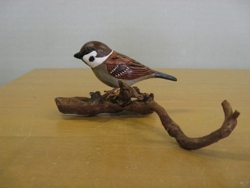 カービングの鳥の完成も間近です。やはり目の位置が作品の重要なポイントになるようで書いては消し書いては消して、納得のいく位置決めに一苦労です。普段見慣れているはず野鳥もいざ作るとなると大きさ、色、形、模様、などなど分からないものですね。この教室も3月に1回を残すのみとなり、色付けをして完成です。