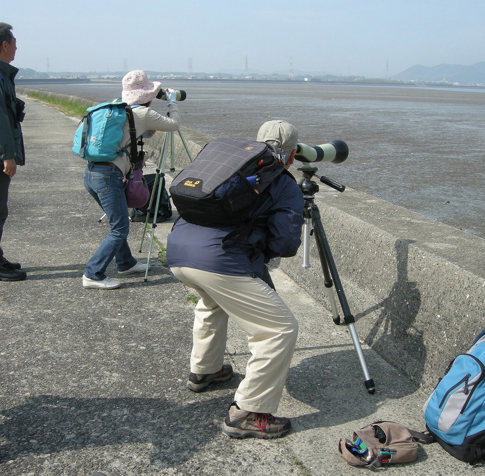 寒くもなく暑くもない春の日差しの中、汐川の堤防を歩きながらの観察会でした。今回は久しぶりにハマシギの大群も見られました。ただ残念だったのが、あまりにも天気が良すぎて期待していた小鳥類が少なかったことでした。それでも確認できた種はシギ・チドリをメインに49種あり、こじんまりとした規模の割りには内容の濃い探鳥会でした。鳥以外ではアカクラゲも大量に見ることができました。