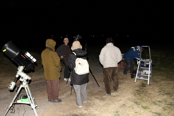 太田川河口、探鳥会ではおなじみの「ハマボウ公園」にて、初めての「星空観察会」が開催されました。少し、雲が流れ全天の星空とは行かなかったが寒さも比較的穏やかな冬の夜、参加者全員、星の誕生や星雲の話などを聞きながら、思いを数万光年の彼方に馳せていました。立派な天体望遠鏡がなくても、いつもの双眼鏡やフィールドスコープを星空に向ければ、新たな世界を見ることが出来ると、再発見させられた初めてのイベントでした。