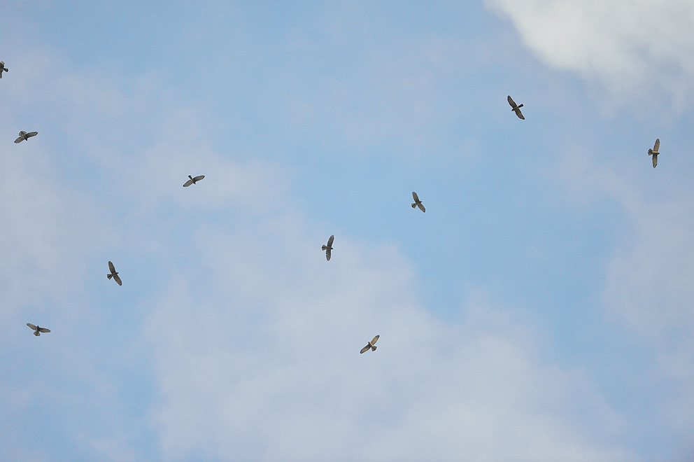 お天気もまあまあで、タカの渡りなどを楽しみました。お目当てのサシバは6:00前から10:00ころまで殆ど切れ目なく1,000羽近く渡って来ました。日本では珍しいコグンカンドリが一羽何回か現れてくれました。