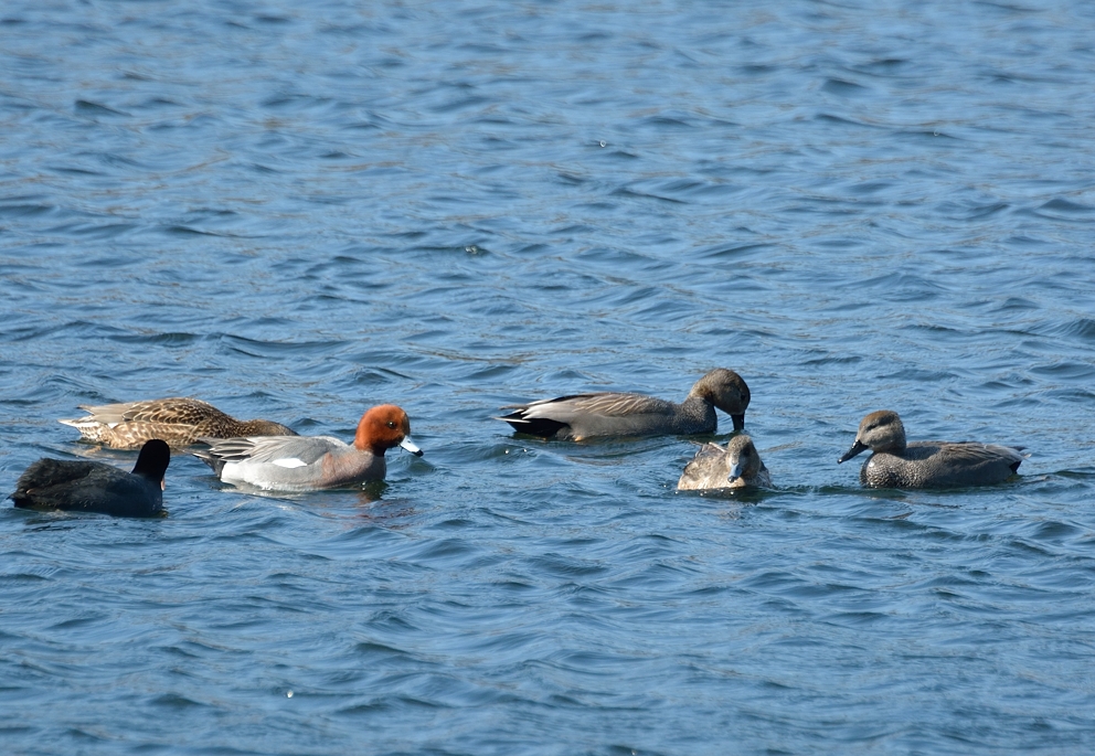 ヒドリガモ(中央左)とオカヨシガモ(右3羽)