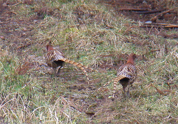 2006.01.21(静岡県・浜松市(旧天竜市)・観音山) ヤマドリ♂-林道を車で走行中に出くわし、目の前で「ホロウチ」をしてから走り去りました。