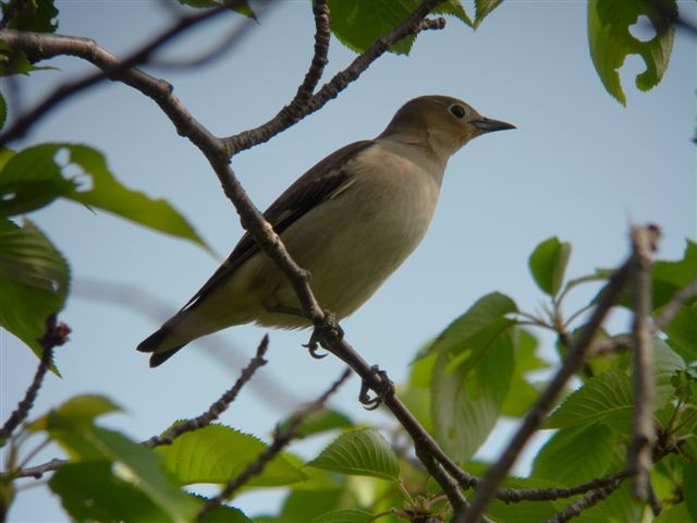 2006.4.26 (静岡県・磐田市)天竜川 コムクドリ25+、カワアイサ♀2、ツグミ- コムクドリは河川敷の新緑の枝に群れて、きれいでかわいい鳥です。 カワアイサは中洲でくつろいでいる様子。ツグミは枝から枝へと移動して、次々に集まってきます。