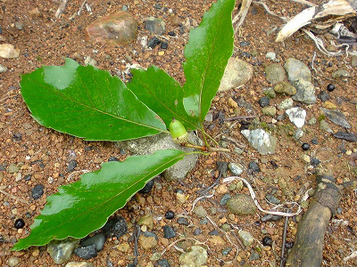 秋の証拠、ハイイロチョッキリ(ゾウムシの仲間)の落したコナラのドングリです。ドングリの中に卵が産んであります。