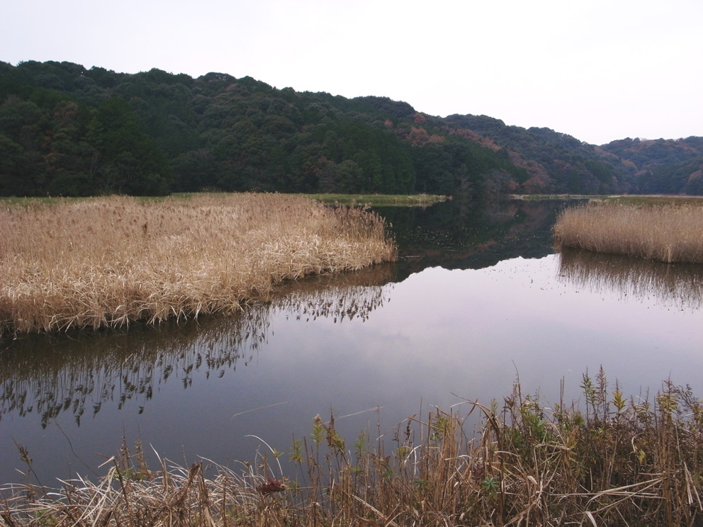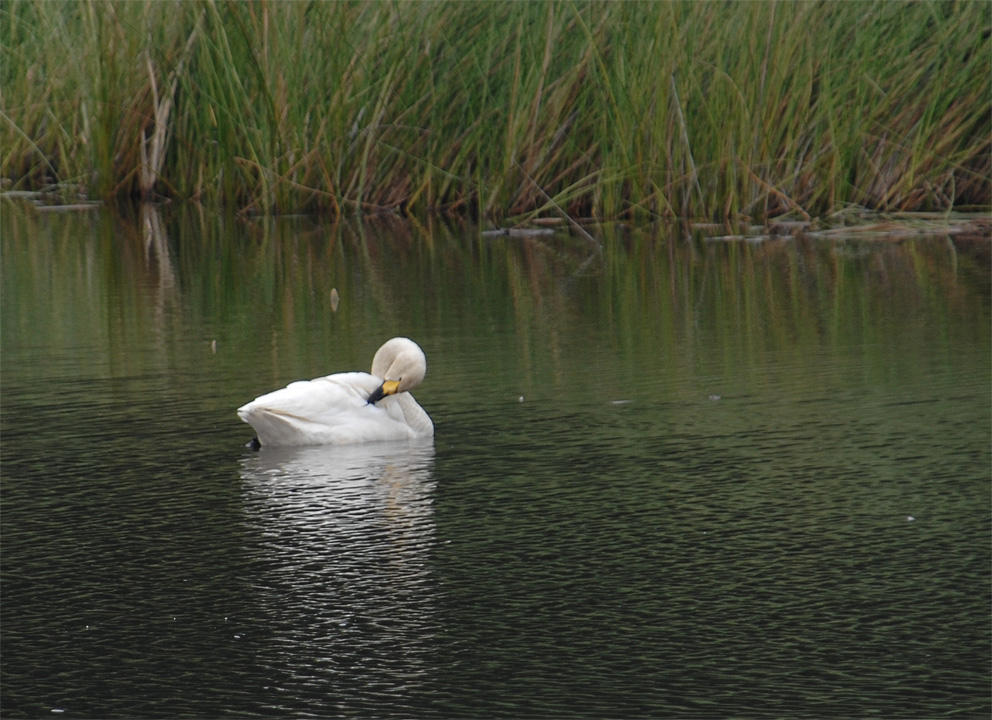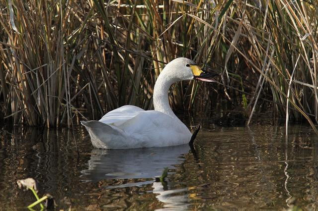 2009.12.6(静岡県・磐田市)鶴ヶ池北端駐車場 コハクチョウ - 朝、鶴ケ池にて4羽のコハクチョウに会うことが出来ました。 道路際、観察テラスの横の葦の辺りで盛んに水中に首を入れ採食をしていました。遅れて到来した一羽は先着の3羽とは常に数メートルの距離を置いて行動していました。