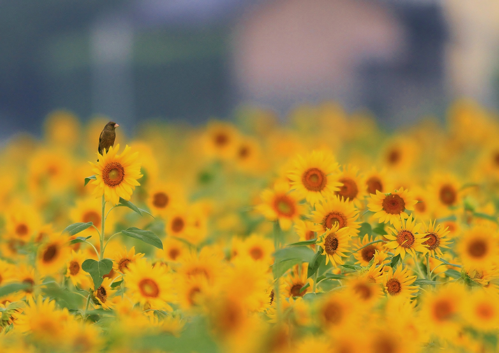 2011.7.30 (静岡県・掛川市)シオーネ会館前 トビ、ツバメ、ヒバリ、キジバト、カワラヒワ等 - 4万本のヒマワリの中でのカワラヒワは黄の海に染まりそうでした。