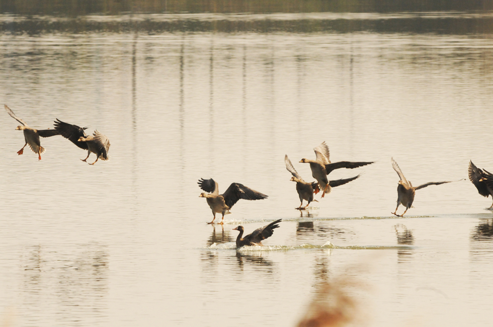 2011.10.12 (静岡県・磐田市)磐田大池 マガン10羽くらい - 9:00-9:30 マガンの群れ(10羽ほど)が立ち寄りました。30分くらい羽を休めて西方に飛び去りました。