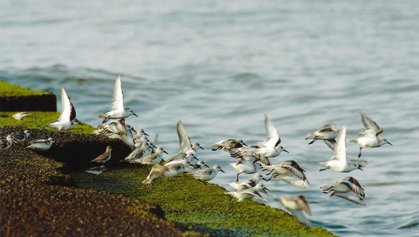 2011.10.8 (静岡県・浜松市)馬込川河口 ミユビシギ60、トウネン10、ハクセキレイ15の混群 - 干潮時にはいない。
