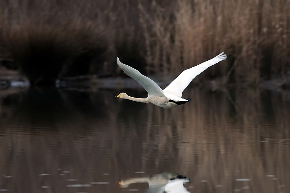 2011.2.19 (静岡県・浜松市)天竜川 オオハクチョウ - 夕方16時半頃、JR鉄橋の約500m下流の河畔にてオオハクチョウを撮影致しました。車中からの撮影のため、オオハクチョウは、のんびりとしていましたが、近くの釣り人に気づき、北に向かって飛び立って行きました。無事に北に戻れると嬉しいです。