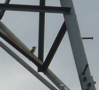 ムクドリの大群が2011.7.1 (静岡県・浜松市)東区豊町 アオサギ、カルガモ、ケリ、ツバメ、モズ、オオヨシキリ - 巣立ちツバメは5兄弟。オオヨシキリが 鉄塔の同じ場所に何度もやってきて行行子と熱唱していました(写真)。オオヨシキリはこんな場所でも囀るのですね。